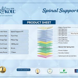 This is a pillow top design mattress with 26cm height. The pillow top design construction has several layers of soft Mega foam that offers cushioning and comfort. Mattress core is made up of Bonnell Spring Unit, which provides unprecedented support.